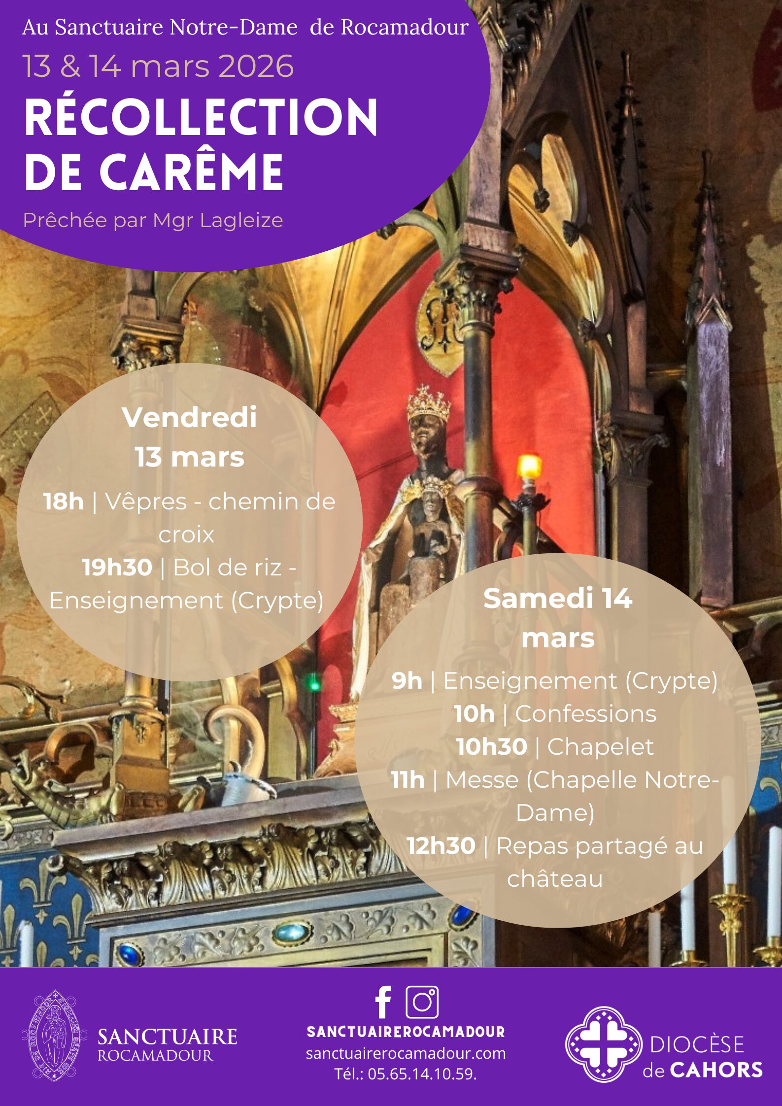 Retraite Pascale prêchée par Mgr Lagleize au Sanctuaire de Rocamadour (13-17 avril 2026) La retraite commencera le lundi 13 avril à 11h00 et se clôturera le vendredi