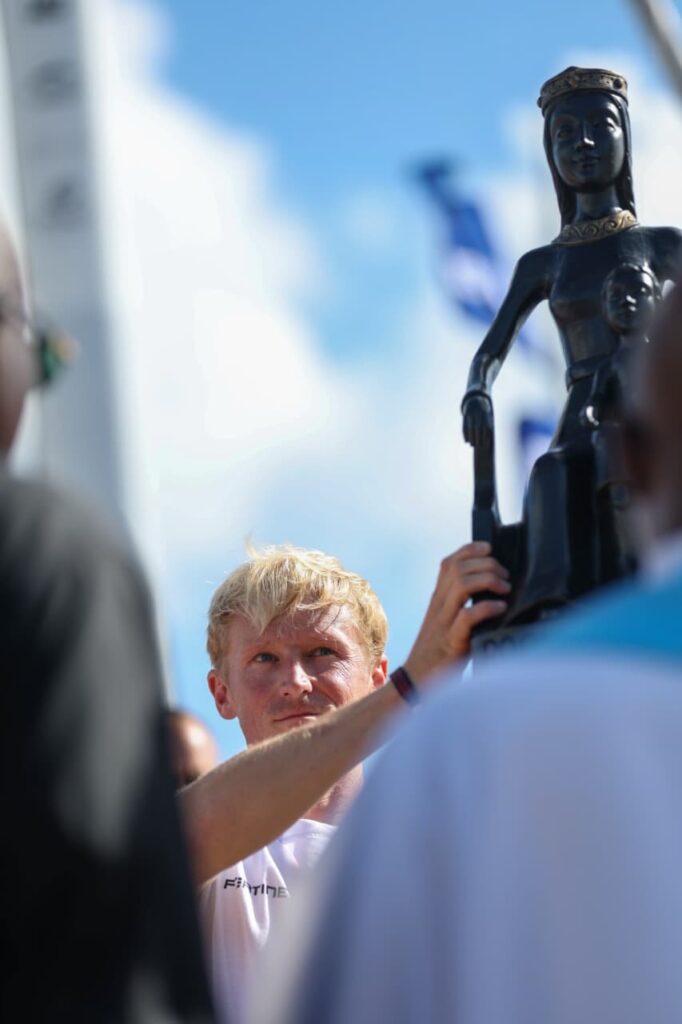 Accueillis par les chants et la ferveur des fidèles, les deux skippers ont présenté la statue, précieusement conservée dans un coffret de bois frappé du logo du Sanctuaire. Un moment marqué par l’émotion !